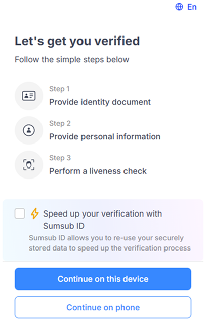 If you want to continue verification on your current device (laptop/PC), click Continue on this device. If you want to continue on your mobile device, click Continue on phone and follow the QR code or copy the link into your mobile browser.