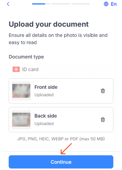 Step 1: Select your ID issuing country once again. Tick a box to select a document type. Make photos of your ID following the instructions listed below. Upload these photos using the image upload boxes and tap on Continue.