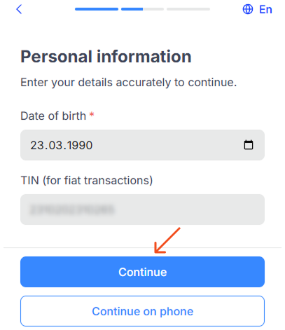 Step 2: After uploading the photos of your ID, you will be asked to provide some personal information. Enter your date of birth, as well as your Taxpayer Identification Number (TIN) if you plan to make transactions with fiat currencies, namely deposits and withdrawals in USD, RUB or KGS via bank transfer. If you do not plan to make such transactions, leave this blank. Click Continue.