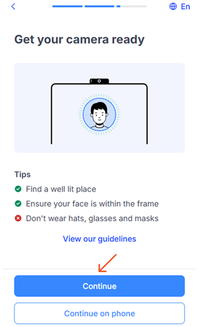 Step 3: Uploading photos of your ID will be followed by a selfie check. You will need a device with a front camera or a webcam on your PC. Check out the tups and guidlines for taking selfies and press Continue, look into the camera and slightly move your head in a circular motion.