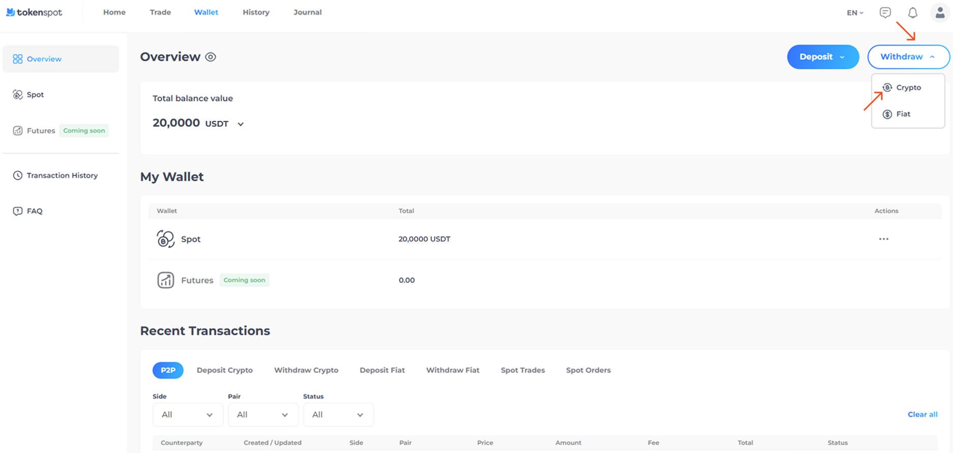 You can view the transaction status and the transaction ID (TxID) in the table Recent Withdrawals below the withdrawal form. If you tap on the transaction hash displayed in the TXID column, you will be directed to the blockchain explorer. To view the full history of cryptocurrency withdrawals from the TokenSpot account, go to Wallet – Transaction History – Withdraw Crypto.